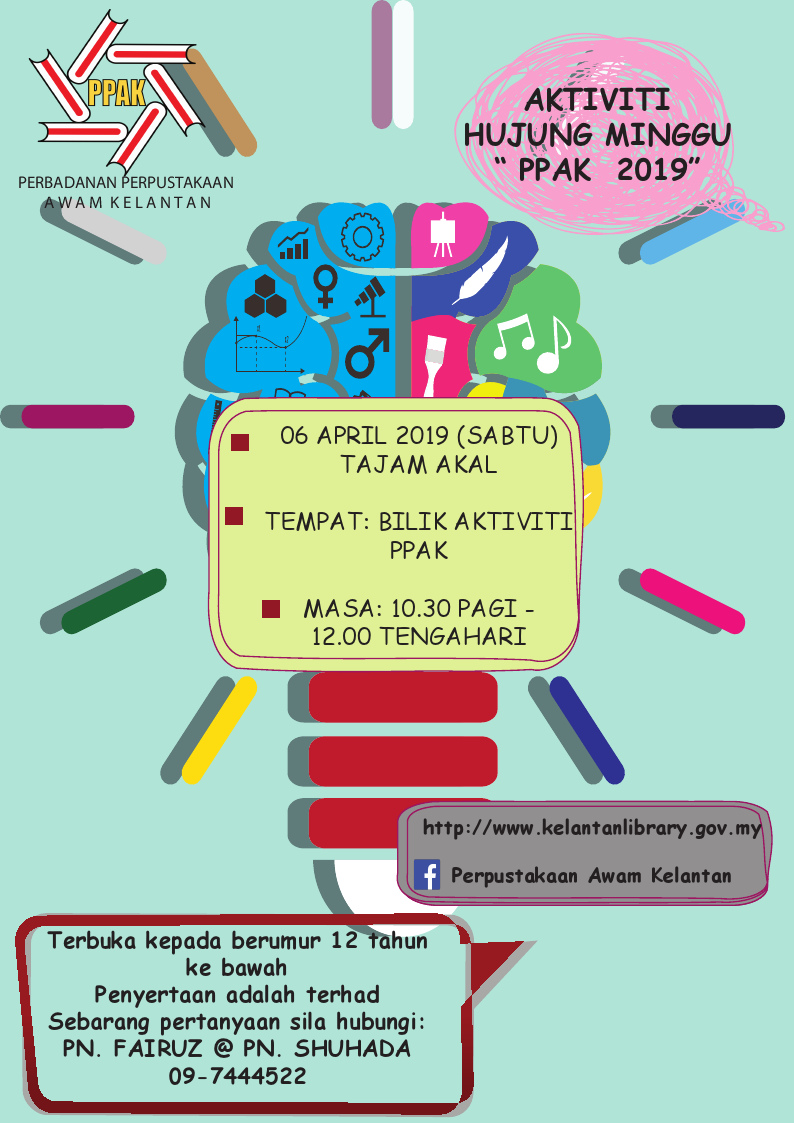 Aktiviti : Mingguan Sabtu Tarikh : 6 April 2019 Masa : 10:30 pagi hingga 12:00 tengahari Tempat : Bilik aktiviti, Perbadanan Perpustakaan Awam Kelantan