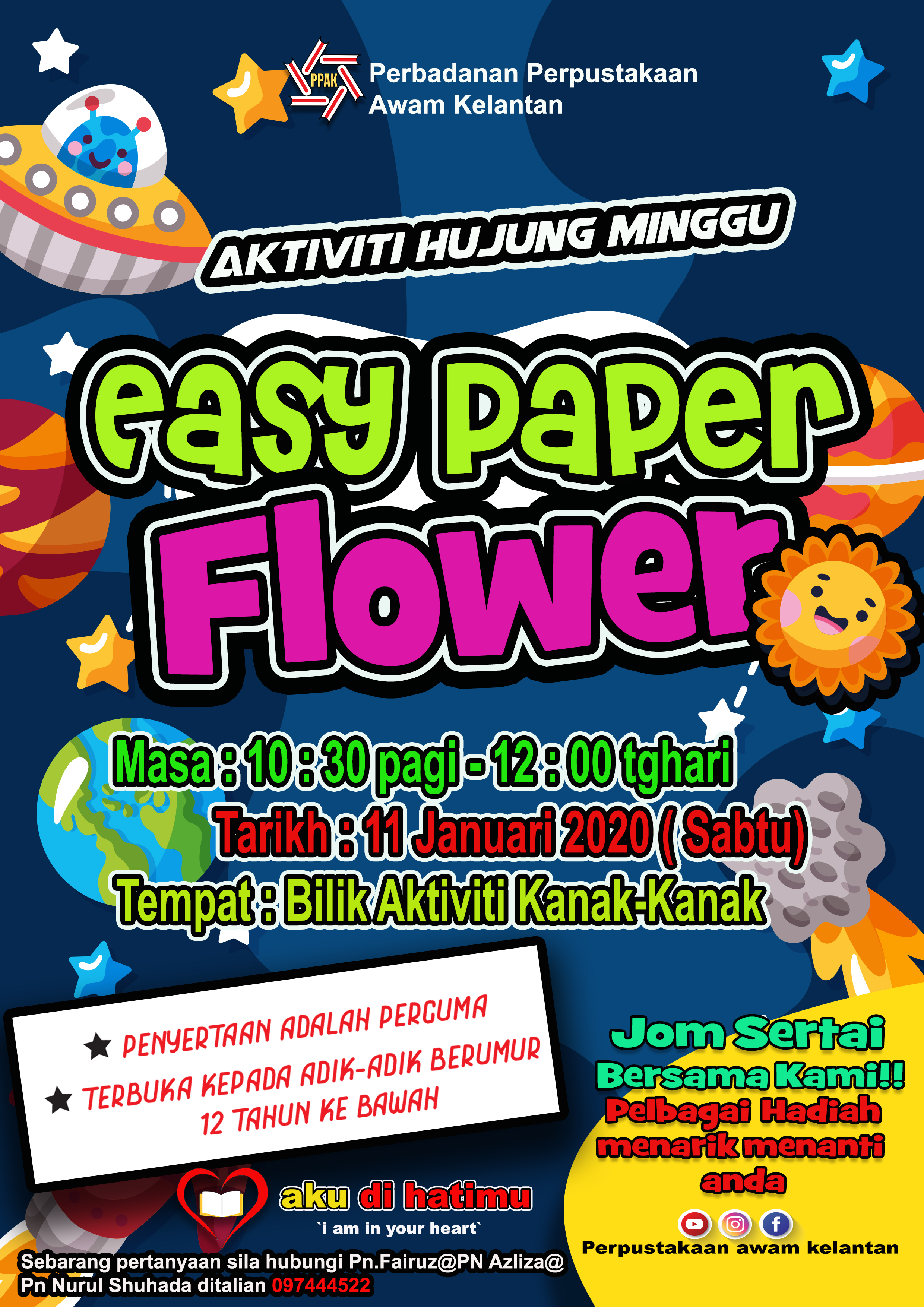 Aktiviti : Mingguan Sabtu Tarikh : 11 Januari 2020 Masa : 10:30 pagi hingga 12:00 tengahari Tempat : Bilik aktiviti, Perbadanan Perpustakaan Awam Kelantan