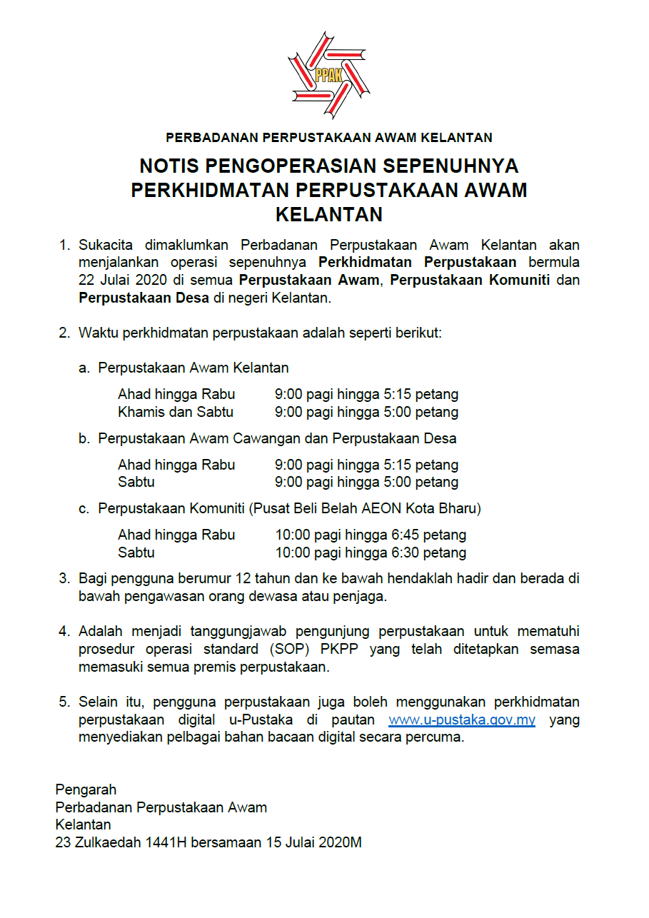 Notis pengoperasian sepenuhnya perkhidmatan Perpustakaan Awam Kelantan Julai 2020