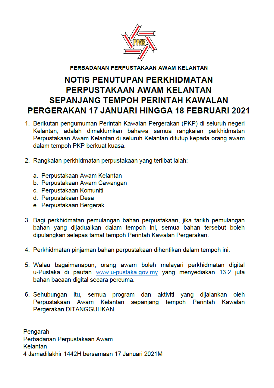 Notis penutupan perkhidmatan perpustakaan berikutan Perintah Kawalan Pergerakan (PKP) 16 Januari 2021