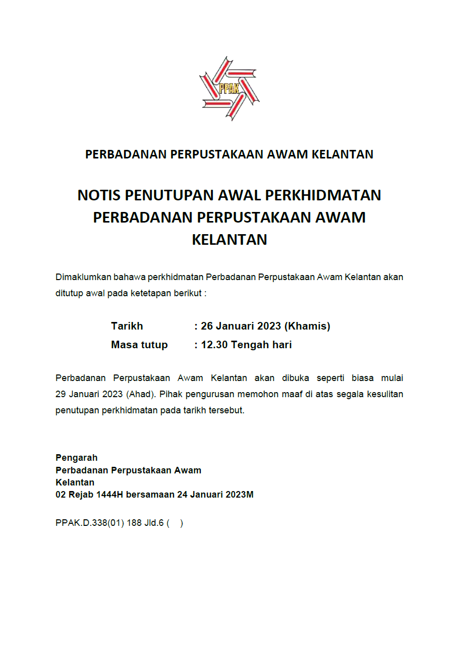 Notis penutupan awal perkhidmatan perpustakaan Written by Pentadbir on 24 January 2023. Posted in Arkib pengumuman aktiviti. Artikel hanya terdapat dalam bahasa Melayu | Article available only in Malay Prev Next
