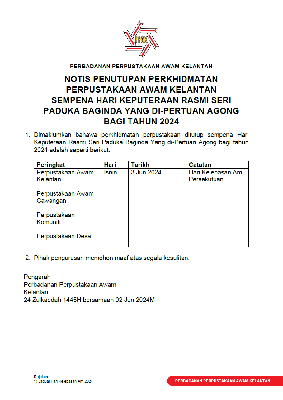 Notis penutupan perkhidmatan perpustakaan sempena Hari Keputeraan Rasmi Seri Paduka Baginda Yang di-Pertuan Agong bagi tahun 2024