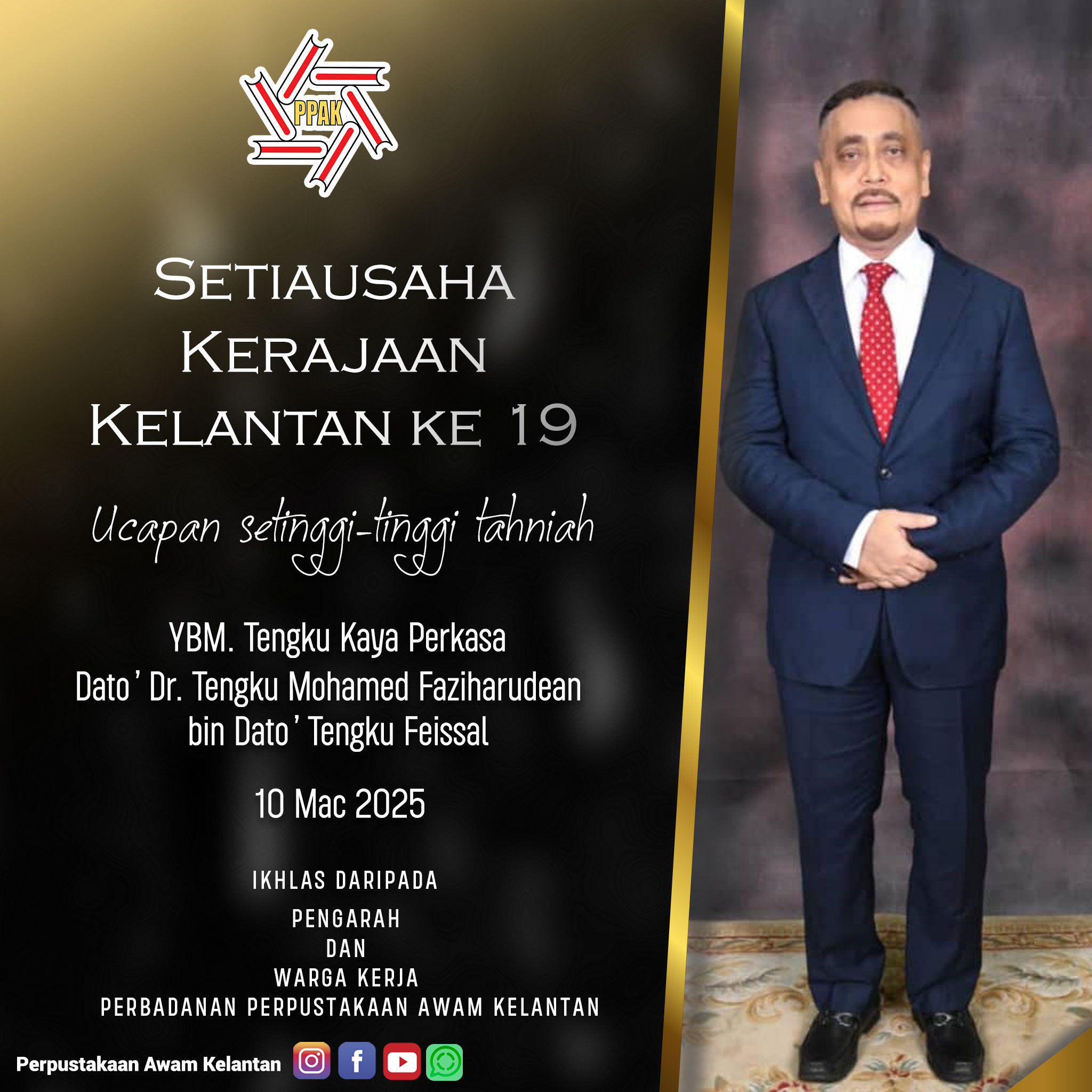 Ucapan Setinggi-tinggi Tahniah. Dengan penuh rasa hormat dan penghargaan, mengucapkan setinggi-tinggi tahniah kepada YBM. Dato' Dr. Tengku Mohamed Faziharudean bin Tengku Feissal (Tengku Kaya Perkasa) atas pelantikan sebagai Setiausaha Kerajaan Negeri Kelantan. Semoga pelantikan ini membawa kejayaan dan kecemerlangan dalam menerajui Pentadbiran Kerajaan Negeri Kelantan. Ikhlas daripada Pengarah dan Warga Kerja Perbadanan Perpustakaan Awam Kelantan.