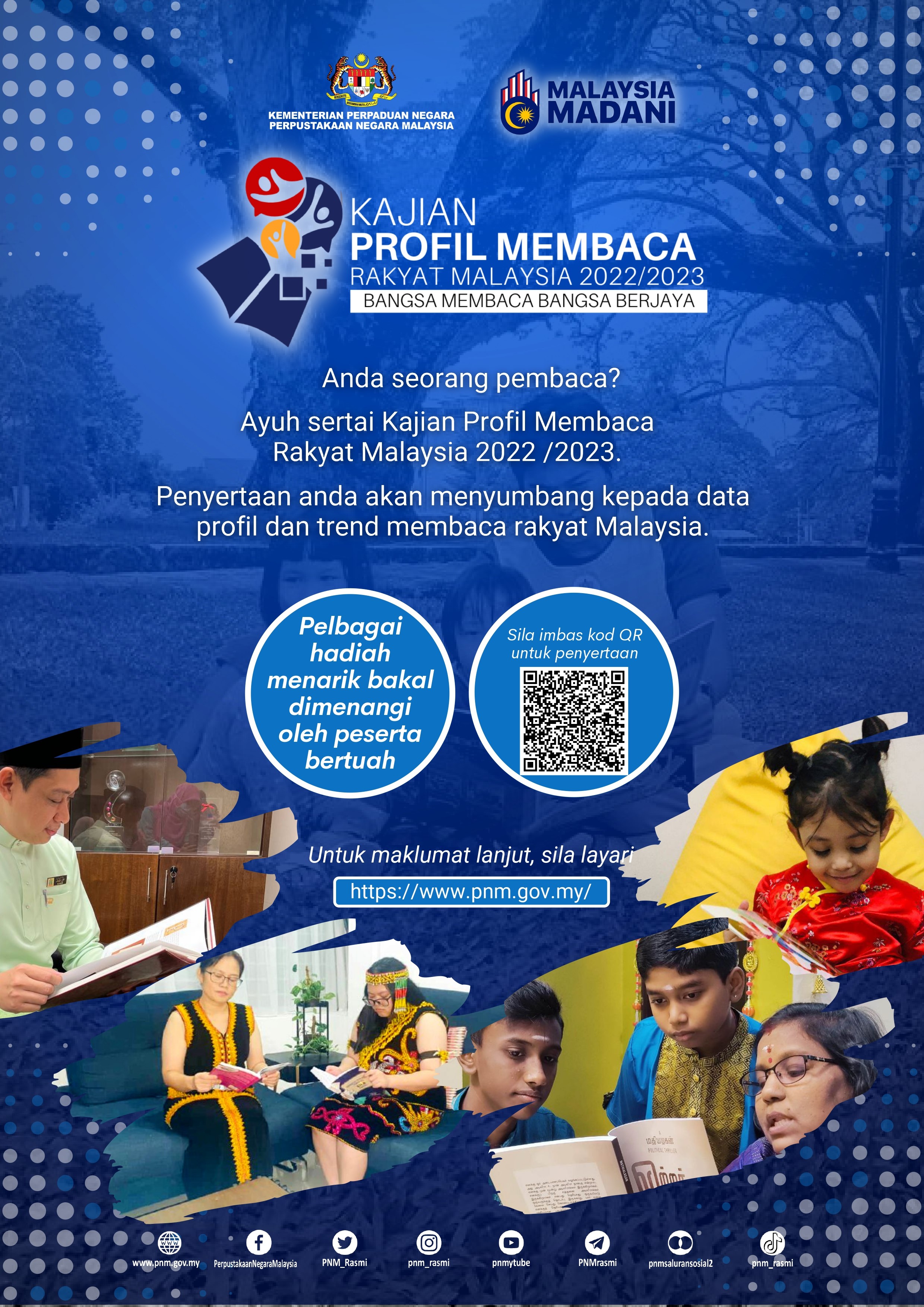 Sukacita dimaklumkan bahawa Perpustakaan Negara Malaysia (PNM) sedang menjalankan Kajian Profil Membaca Rakyat Malaysia 2022/2023. Objektif kajian adalah untuk mewujudkan satu profil membaca rakyat Malaysia yang terkini bagi dijadikan sebagai rujukan mengenai kadar pembacaan dan tabiat membaca dalam kalangan rakyat Malaysia.