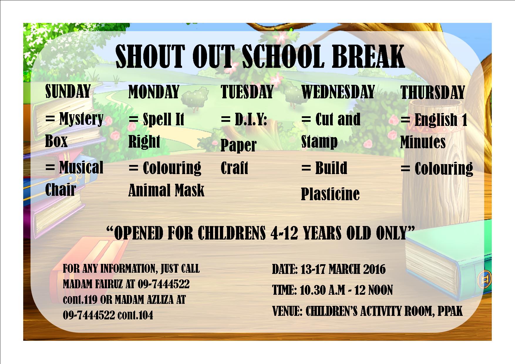 March 2016 school break activity Written by Pentadbir on March 03, 2016. Posted in Arkib pengumuman aktiviti. Artikel hanya terdapat dalam bahasa Inggeris | Article available only in English Activity : March 2016 school break activityDate : March 13 - 17, 2016Time : 10:30 a.m. to 12:00 p.m.Venue : Bilik Aktiviti, Perbadanan Perpustakaan Awam Kelantan Prev Next