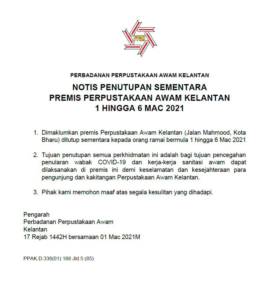 Notis penutupan sementara premis Perpustakaan Awam Kelantan 1 hingga 6 Mac 2021