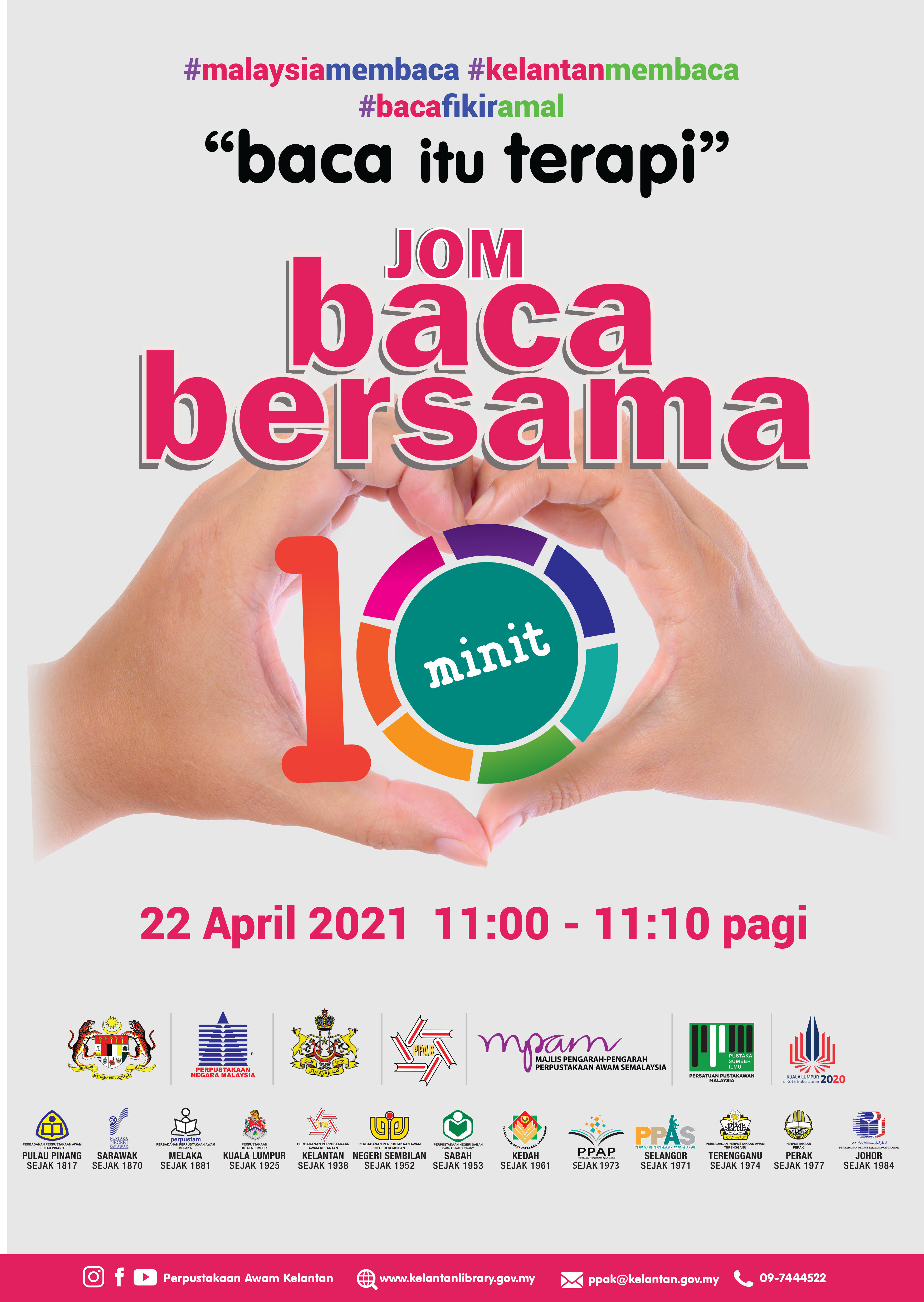 Perbadanan Perpustakaan Awam Kelantan dengan kerjasama Perpustakaan Negara Malaysia dan Majlis Pengarah-Pengarah Perpustakaan Awam Se-Malaysia akan mengadakan program Jom Baca Bersama 10 Minit “baca itu terapi” secara serentak seluruh Malaysia.