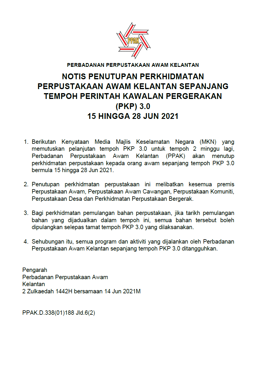 Notis penutupan Perkhidmatan Perpustakaan Awam Kelantan sepanjang tempoh Perintah Kawalan Pergerakan (PKP) 3.0 15 hingga 28 Jun 2021