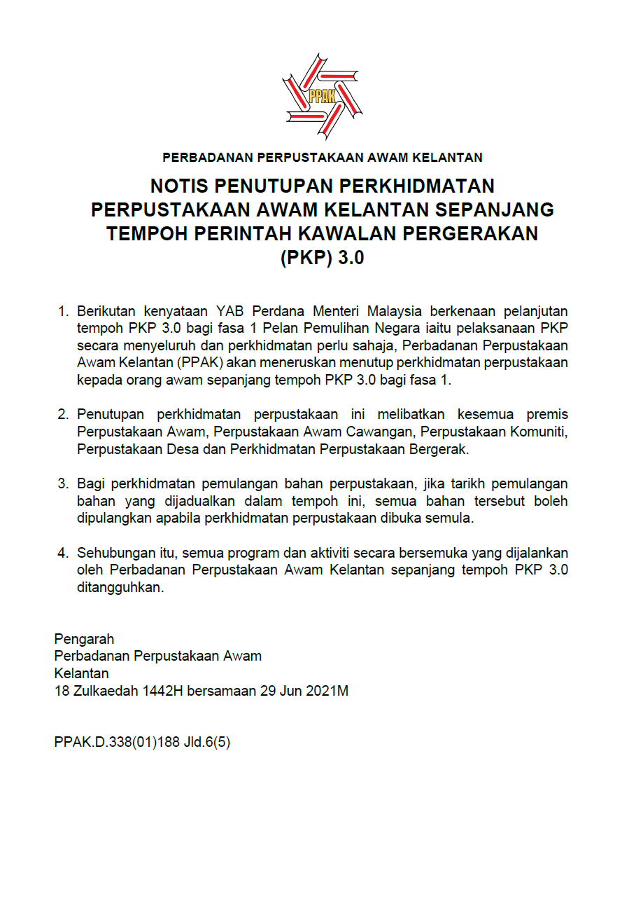 Notis penutupan Perkhidmatan Perpustakaan Awam Kelantan sepanjang tempoh Perintah Kawalan Pergerakan (PKP) 3.0 fasa 1