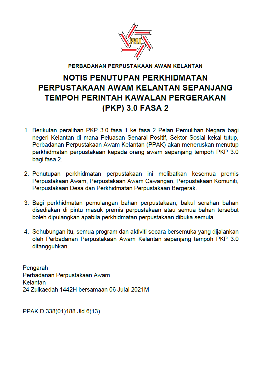 Notis penutupan Perkhidmatan Perpustakaan Awam Kelantan sepanjang tempoh Perintah Kawalan Pergerakan (PKP) 3.0 fasa 2