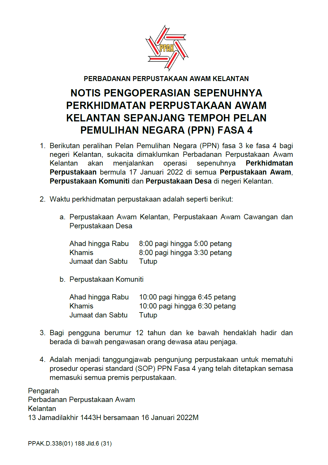 Notis pengoperasian sepenuhnya perkhidmatan Perpustakaan Awam Kelantan sepanjang tempoh Pelan Pemulihan Negara Fasa 4