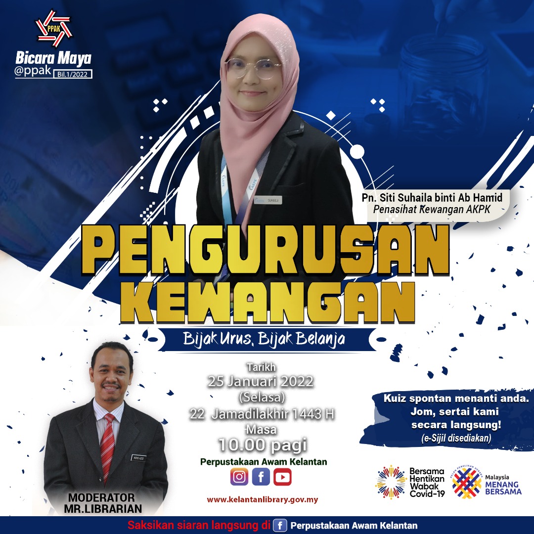 Program: Bicara Maya @PPAK: Pengurusan Kewangan - Bijak Urus, Bijak Belanja Tarikh: 25 Januari 2022 Masa: 10:00 pagi Panel: Puan Siti Suhaila binti Ab Hamid Tempat: Secara Langsung di Facebook Perpustakaan Awam Kelantan