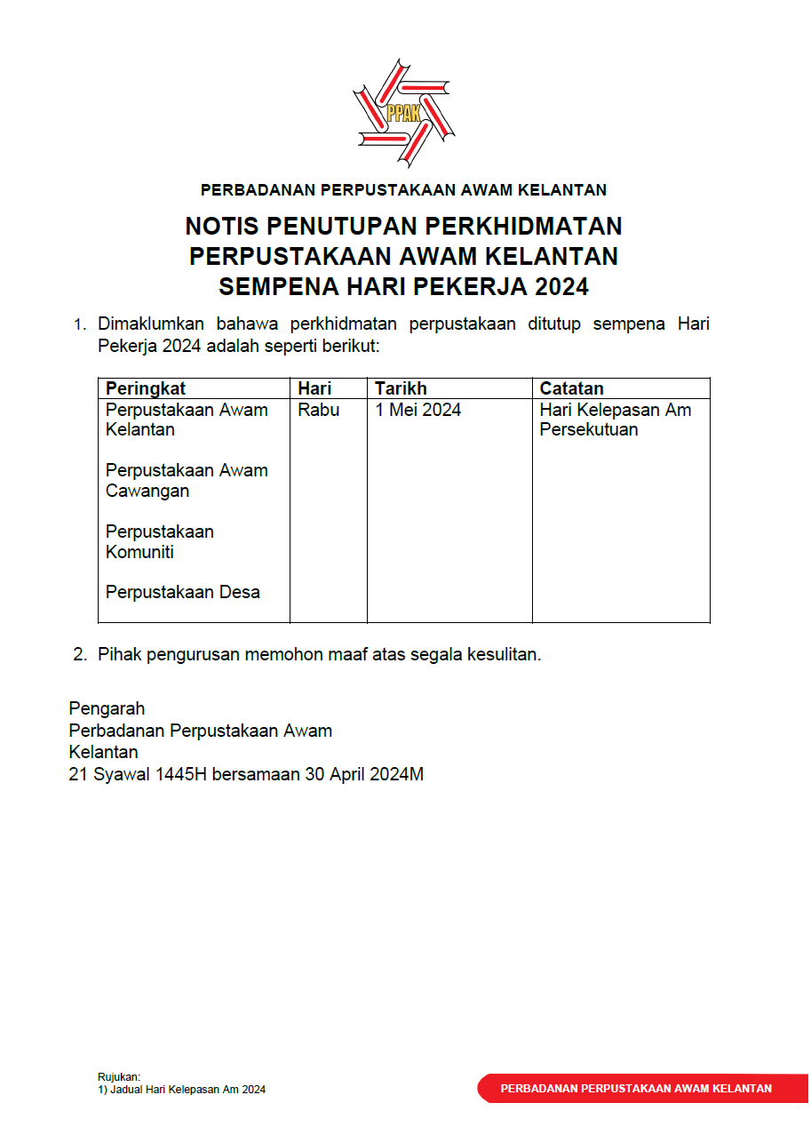 Notis penutupan perkhidmatan perpustakaan sempena Hari Pekerja 2024 Written by Pentadbir on April 30, 2024. Posted in Arkib pengumuman aktiviti. Artikel hanya terdapat dalam bahasa Melayu | Article available only in Malay Prev Next
