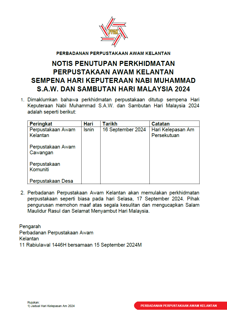 Notis penutupan perkhidmatan perpustakaan sempena Hari Keputeraan Nabi Muhammad S.A.W. dan Sambutan Hari Malaysia 2024