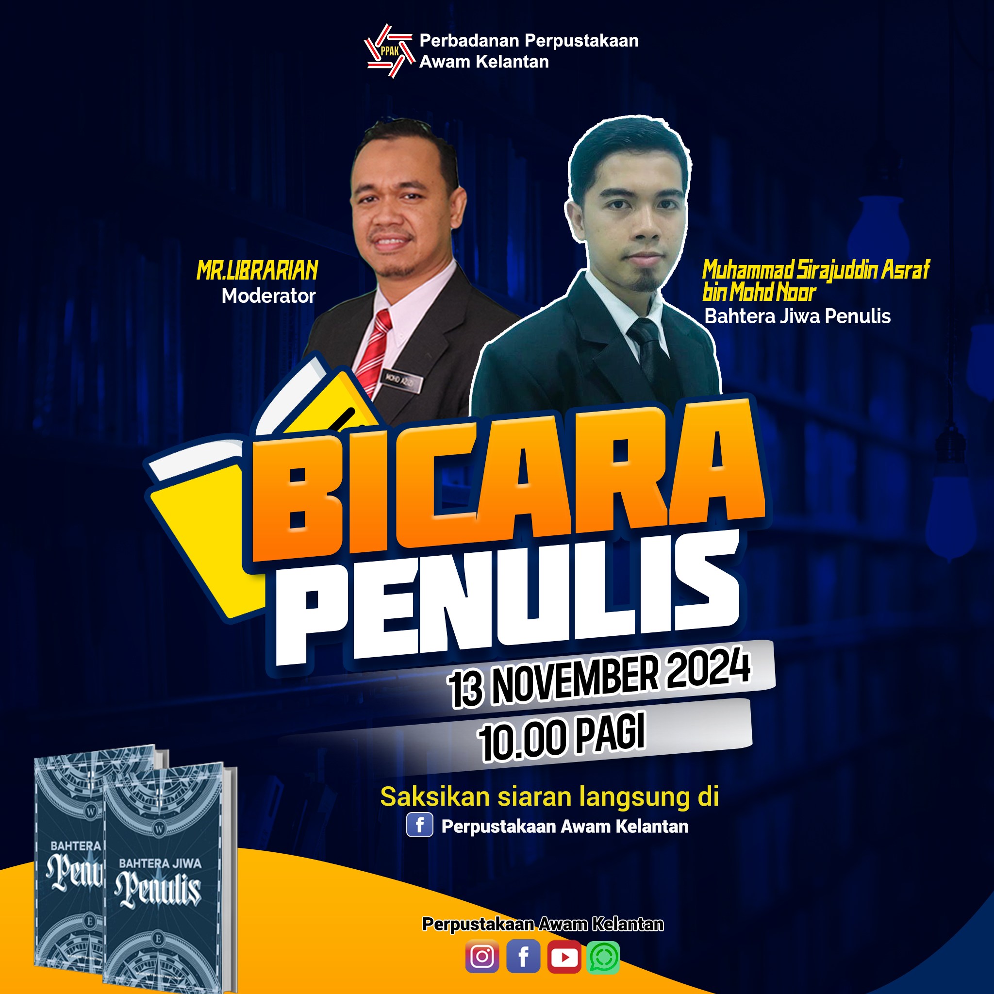 Program: Bicara Penulis @PPAK: Muhammad Sirajuddin Asraf bin Mohd Noor - Bahtera Jiwa Penulis Tarikh: 13 November 2024 Masa: 10:00 pagi Tempat: Secara Langsung di Facebook Perpustakaan Awam Kelantan