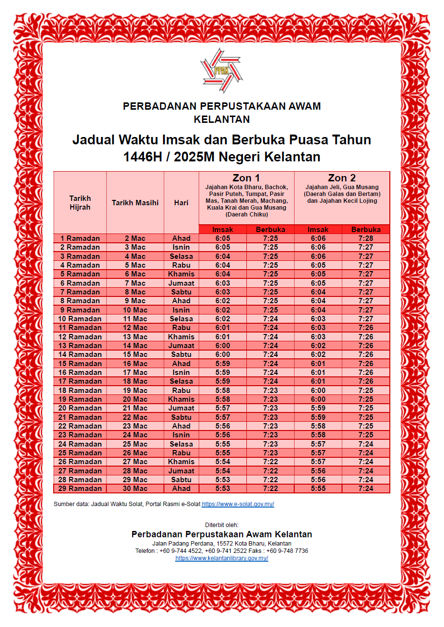 Jadual Waktu Imsak dan Berbuka Puasa Tahun 1446H / 2025M Negeri Kelantan