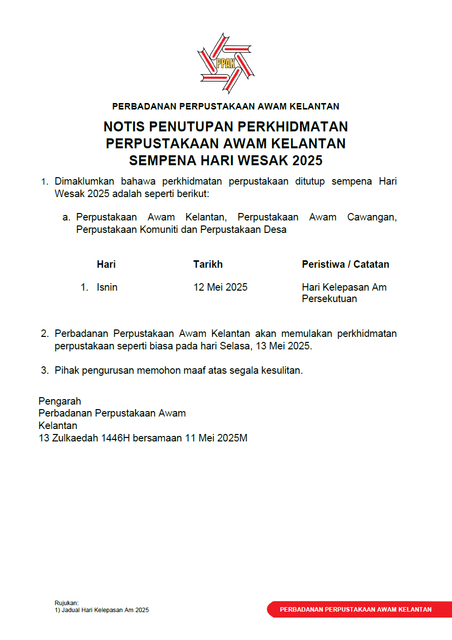 Notis penutupan perkhidmatan perpustakaan sempena Hari Wesak 2025