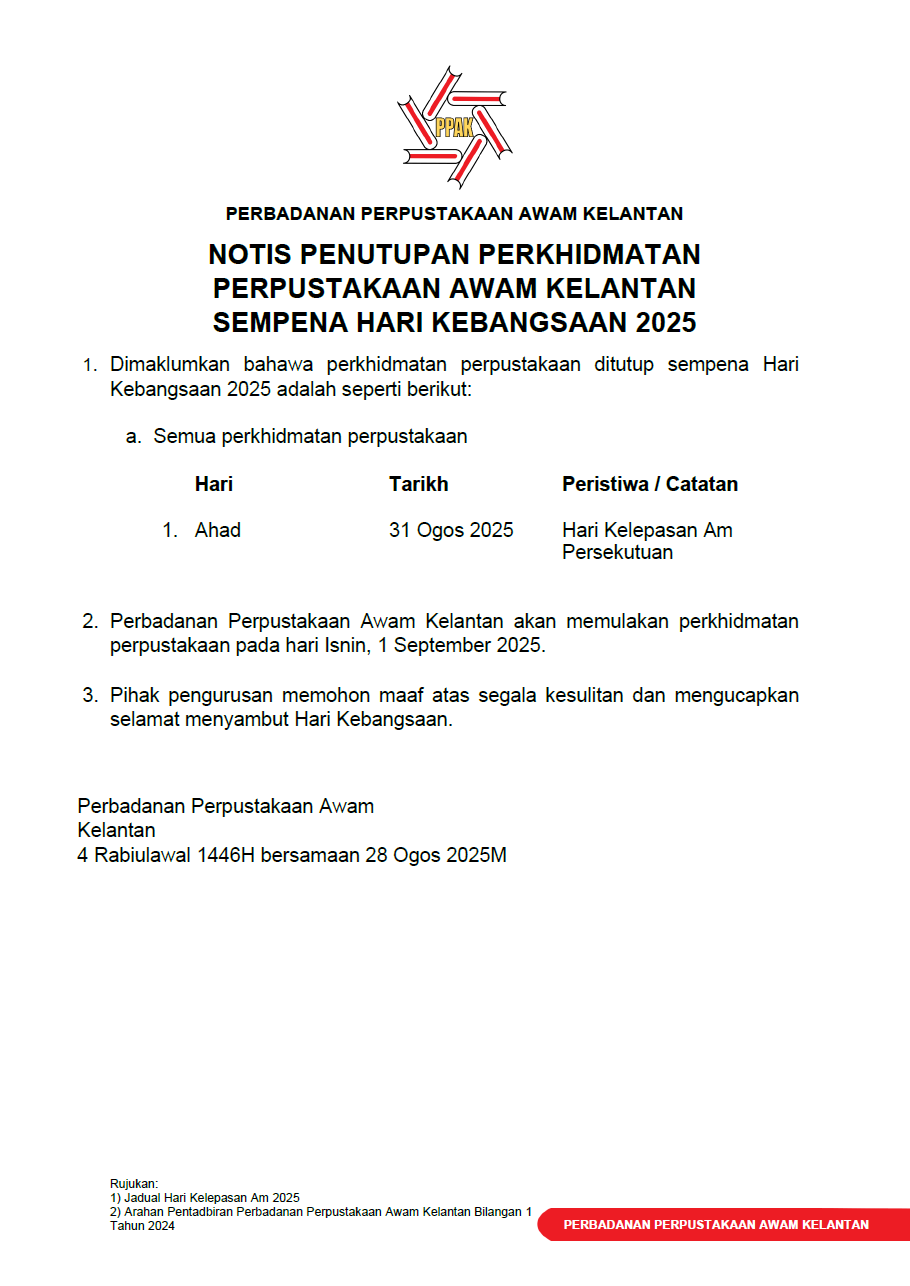 Notis penutupan perkhidmatan perpustakaan sempena Hari Kebangsaan 2025