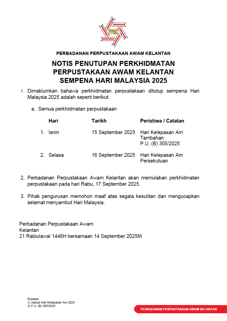Notis penutupan perkhidmatan perpustakaan sempena Hari Malaysia 2025 Written by Pentadbir on September 14, 2025. Posted in Arkib pengumuman aktiviti. Artikel hanya terdapat dalam bahasa Melayu | Article available only in Malay Prev Next