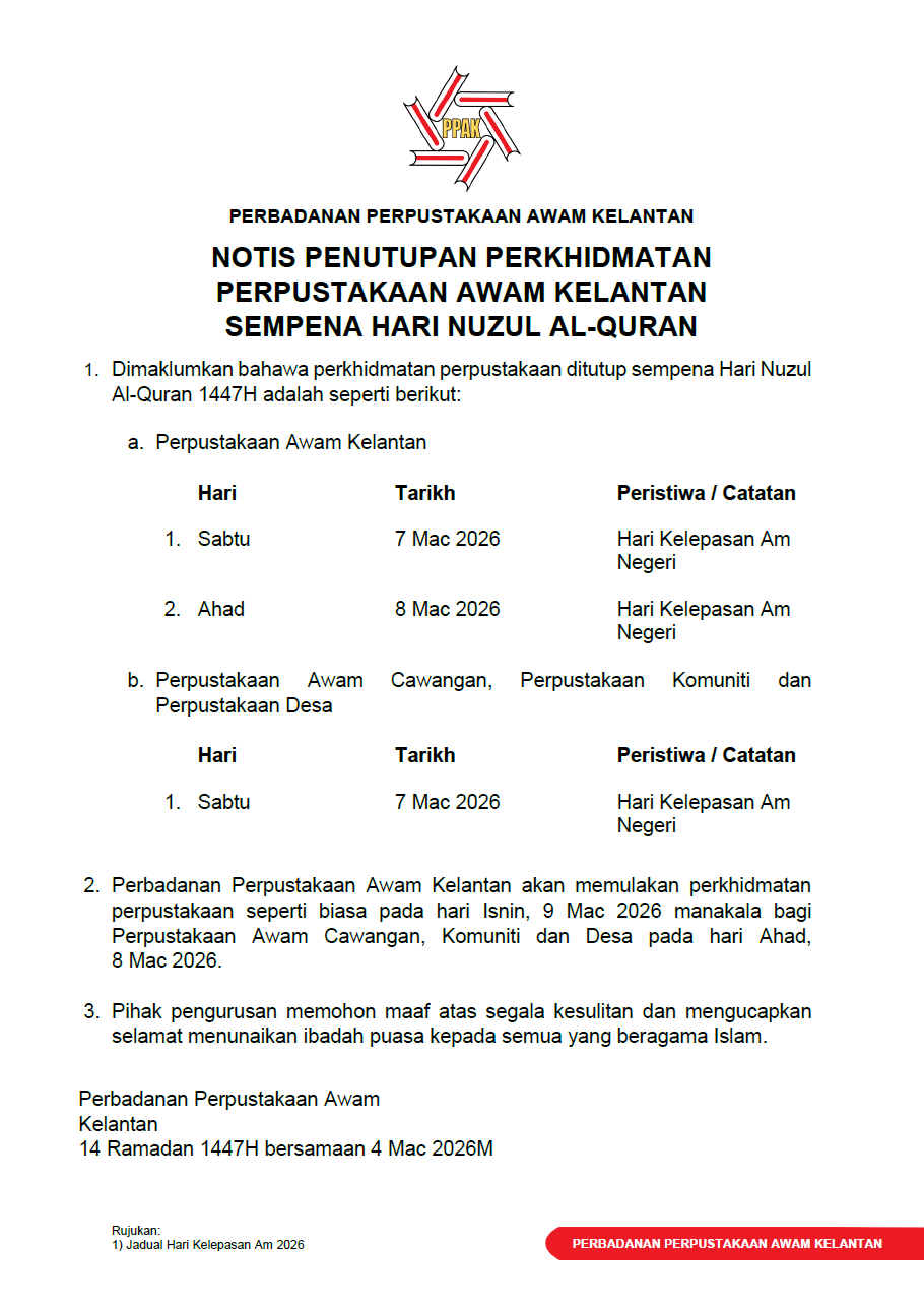 Notis penutupan perkhidmatan perpustakaan sempena Hari Nuzul Al-Quran 1447H Written by Pentadbir on March 17, 2025. Posted in Arkib pengumuman aktiviti. Artikel hanya terdapat dalam bahasa Melayu | Article available only in Malay Prev Next